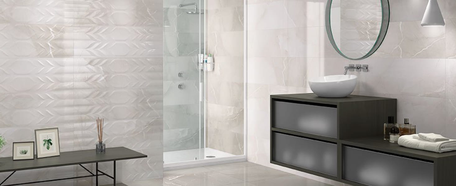 Azteca uhkete marmorikirjute ja mustriliste efektplaatidega lood suursuguse, harmoonilise vannitoa.